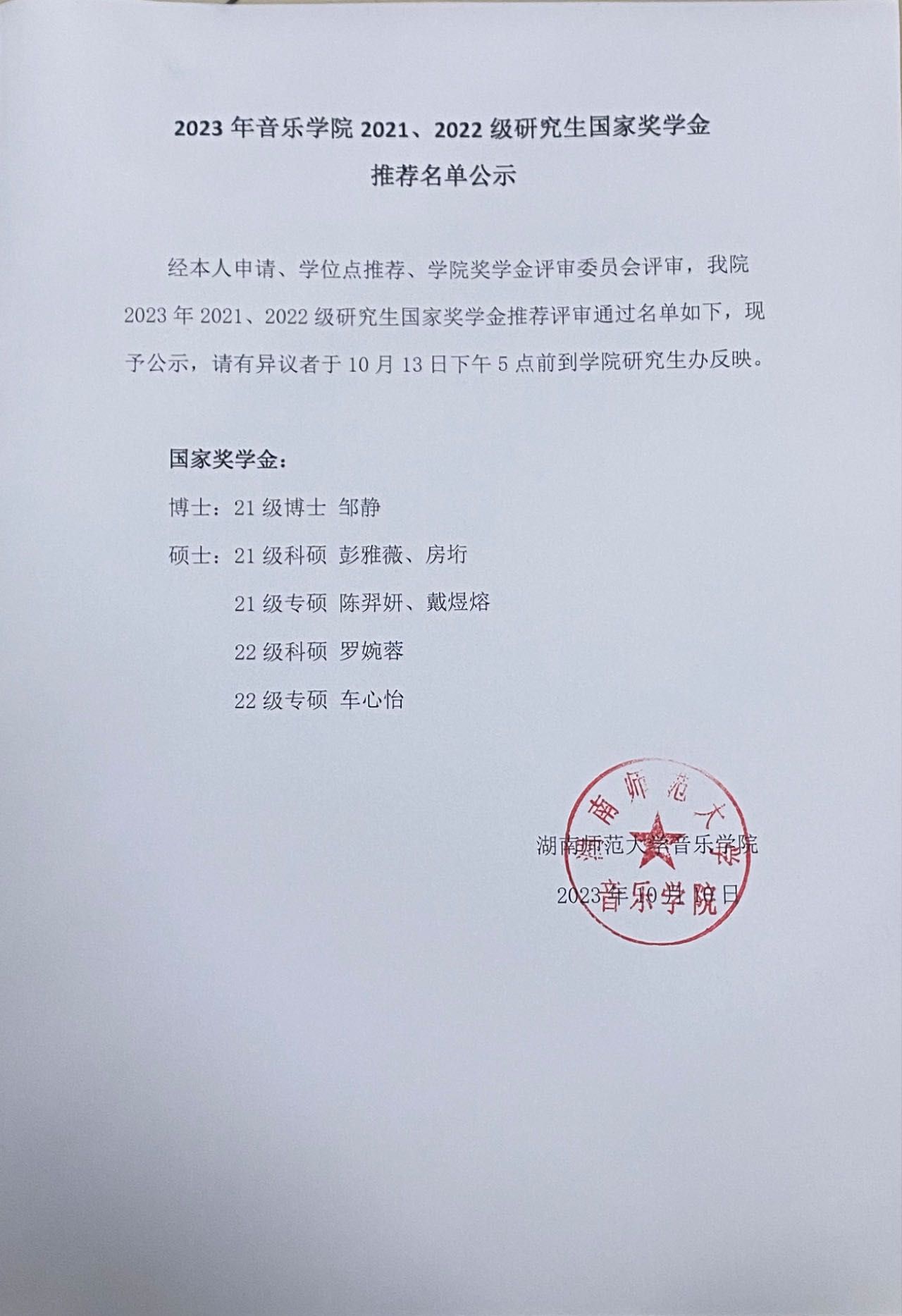 2023年音乐学院2021、2022级研究生国家奖学金推荐名单公示
