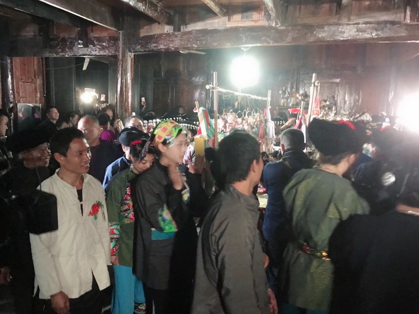 24日上午10点,首先举行了“买牛”的仪式,随后亲戚(“大舅爷、二舅爷”)与各方乡邻朋友陆续赶到吴海深老师家中。一路上,唢呐声声,锣鼓咚咚,苗族姑娘们身着节日盛装从四面八方向吴海深老师家里涌来。接亲(“大舅爷、二舅爷”)仪式热闹非凡。同时在村外的田间地头处,石山东老师和他的儿子石进海老师也在进行“上刀山”仪式,当石进海老师登上刀山的最高处时吹响牛角时,那惊险的一幕,使大家顿时屏住了呼吸,盛赞这个年轻后生的勇气与胆魄。晚上八点进行的“嘟乐”仪式,是苗家人的一次集体的“狂欢”,歌声、鼓声、锣声、钹声、唢呐声、欢笑声、起哄声一阵高过一阵,把整个“仪式”推向了高潮。