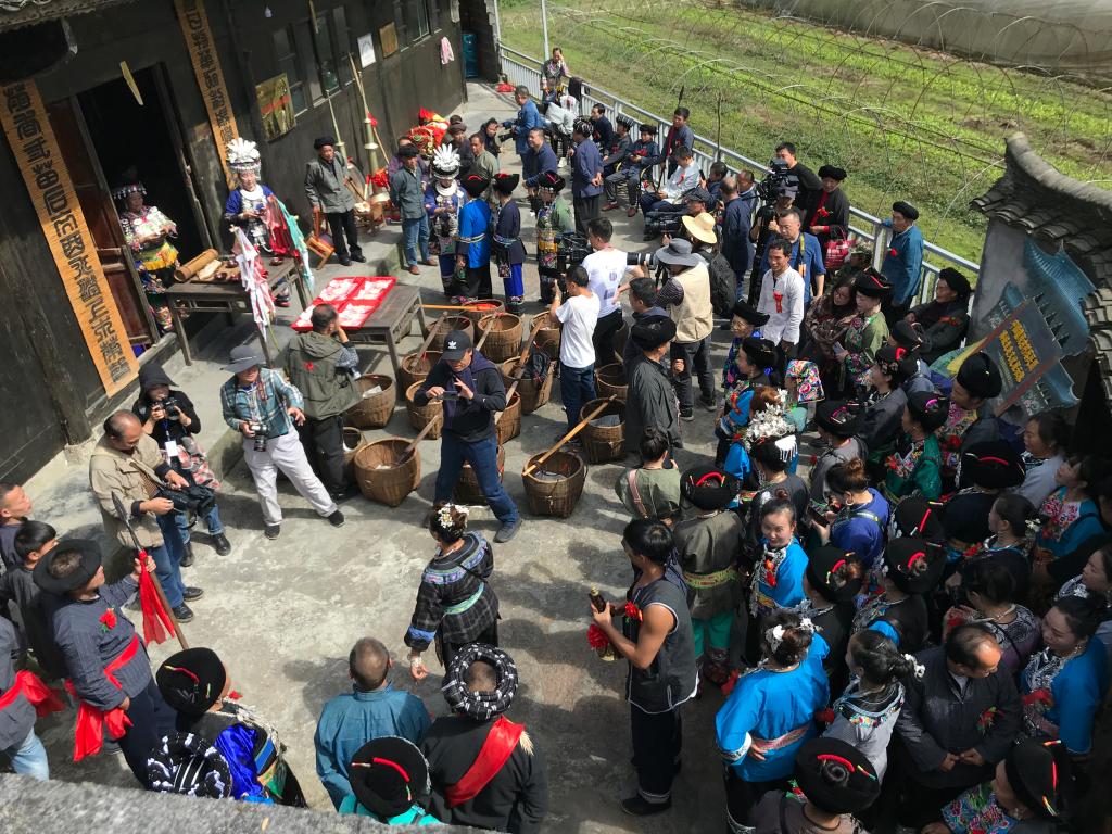 10月23日,团队一行到达湘西土家族苗族自治州花垣县板栗村,此行目的,主要是对“生苗”地区的苗歌、苗鼓、苗唢呐与苗族古老的“椎牛”仪式等苗族音乐文化进行考察,同时对苗族的巴代雄、巴代扎进行口述采访。板栗村此次“椎牛”祭祖活动是为配合州文旅局拍摄影像志而建构起来的一次带有“表演”性质的“非遗”民俗活动。