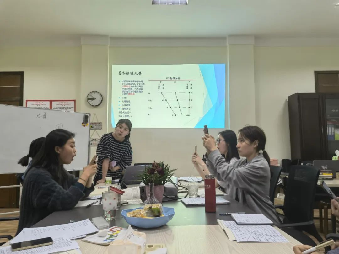 2022年4月29日晚上18:30,湖南师范大学中国南方少数民族研究中心在音乐学院舞蹈楼205进入了国际音标课程第二阶段的系统性学习,课程由湖南师范大学文学院2019级语言学及应用语言学专业研究生邹亚敏讲授,参与本次课程学习的有“中心”主任赵书峰教授,还有湖南女子学院曹玲玉副教授,以及在读硕、博研究生杨声军、肖志丹、李静、徐花、房珩、周心雨、易泽英等九人。