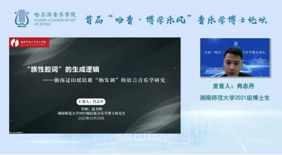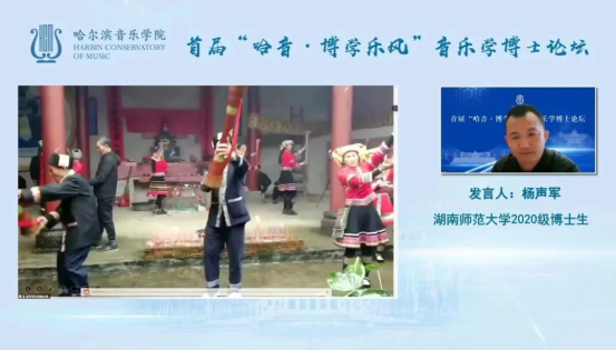 2022年10月28日下午13点30分,由哈尔滨音乐学院举办的“哈音·博学乐风”音乐学博士论坛拉开帷幕,本次论坛以线上发言的形式举行,湖南师范大学音乐学院“中国南方少数民族音乐文化研究中心”2020级民族音乐学专业博士研究生杨声军、余媛,2021级博士研究生肖志丹受邀参加本次论坛的发言。