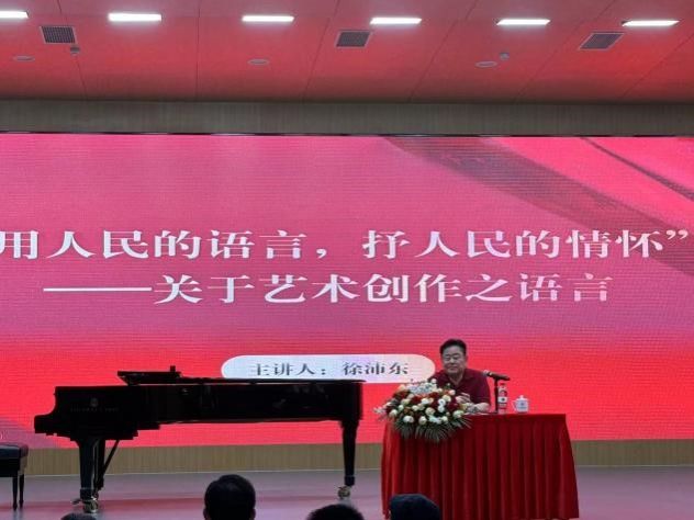 徐沛东老师以著名画家黄永玉先生的画展为导入,开始讲座,他分析了艺术语言如何受到大众欢迎,阐述了语言在艺术创作中的重要性,并结合自己丰富的创作经验,分享了如何运用人民的语言和情怀进行艺术创作。徐老师结合习近平总书记在文艺座谈会上的重要讲话精神,通过对他创作的《篱笆的影子》《亚洲雄风》《黄河渔娘》等作品的讲解与欣赏,分析了如何在音乐创作中运用独特的地方语言、时代语言、民族语言等来表达情感和刻画形象。