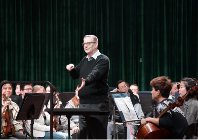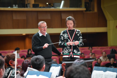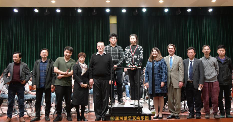 晚上,玛莎·伯格校长一行观赏了我院潇湘爱乐交响乐团的排练,音乐与戏剧学院院长马克·帕克博士在我院举办了指挥大师班。匡君主持大师班并代表我院对美国奥城大学各位领导的到来表示热烈的欢迎。马克·帕克博士对两名指挥专业的学生进行了专业化的指导,并指挥乐团演奏了贝多芬的《第三交响曲》第一乐章。马克·帕克博士对我院潇湘爱乐交响乐团给予了高度评价。国际交流合作处处长陈云江、人事处副处长尹建新、我院党委书记罗嵘与奥城大学领导一同观摩了这次大师班。