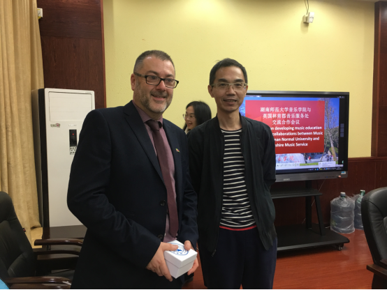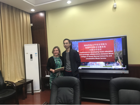 11月13日下午 ,英国林肯郡音乐服务处的高级顾问珍妮弗·麦基和西北地区主管马廉·达克斯来访音乐学院。湖南师范大学音乐学院副院长匡君,湖南师范大学国交处交流科科长廖阿琼,湖南师范大学国交处欧洲交流项目主管彭霞,湖南师范大学音乐学院中外合作办学副主任杨琦,湖南师范大学音乐学院中外合作办学干事陈彩云出席了此次访问。