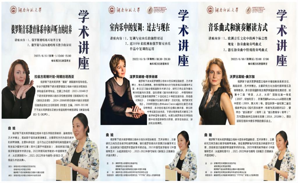 (通讯员 杨婉娴 陈艺木 夏诗颖)2022年6月6至10日,俄罗斯国立格林卡音乐学院委派优秀教师为我院学子举行了系列学术讲座,内容涵盖曲式、复调及视唱练耳等方向,主讲人分别为俄罗斯喜剧剧院剧本指导总监拉兹古莉娅叶娃·阿娜丝塔西亚,俄罗斯国立格林卡音乐学院副教授涅罗芙娜娅·塔季扬娜、继续教育系主任沃罗比耶娃·奥尔加,由该校副教授曲娃担任全程翻译。本次活动由湖南师大国交处、音乐学院及俄罗斯国立格林卡音乐学院共同举办,湖南师范大学音乐学院研究生“FTPRI”新型人才培养项目支持。