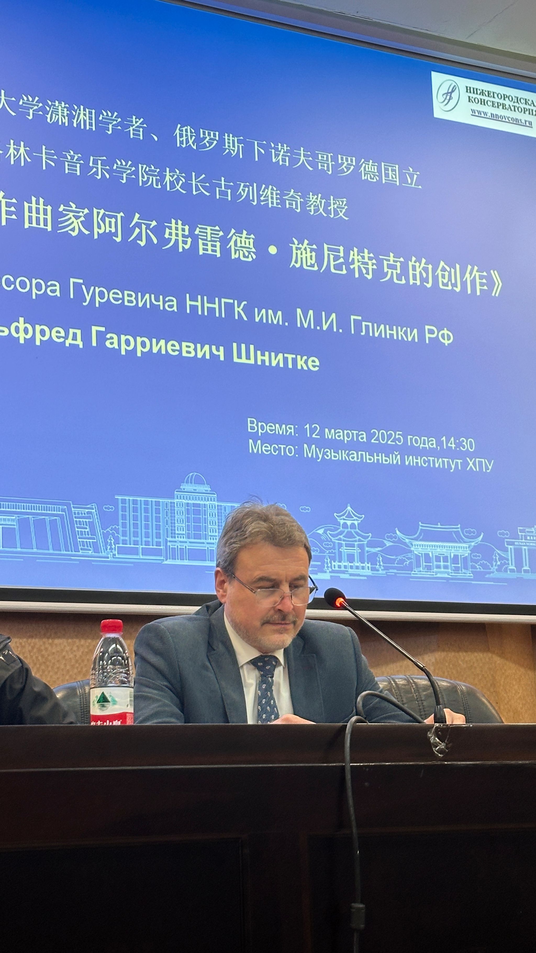 3月12日,古列维奇作题为《阿尔弗雷德·施尼特凯的创作》的讲座。施尼特凯作为“苏联第二代作曲家”,创作了众多体裁丰富的作品。古列维奇以《古风歌组曲》《第一交响曲》《第一号大协奏曲》《中提琴协奏曲》《果戈里组曲》等多部作品为例深入剖析了施尼特凯的“多风格主义”。他谈到施尼凯特的音乐常用尖锐极端的音响效果以表现现代人内心深处的精神冲突,并着重解析了《第一交响曲》,指出这部作品融合多种风格流派,展现出艺术与人类命运的紧密联系,让师生们领略到施尼特凯作品中的宏大构思与深刻内涵。