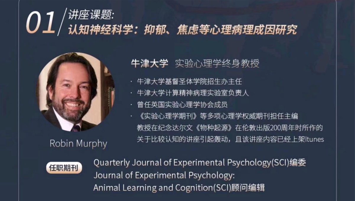 619日下午2:30在和乐楼108教室牛津大学实验心理学教授Robin Murphy以“认知神经科学: 抑郁、焦虑等心理病理成因研究”为主题2020级音乐学师范专业师生做线上课程讲座分享其通过基础心理学研究方法论和计算层面的分析以人的行为 (学习和动机) 和认知 (记忆和注意力) 为基础,来研究人的精神疾病。教授从介绍心理学基础理论 (动物学习与行为模型)开始,后进一步介绍计算理论 (错误修正理论和自由能量原理),及这些理论如何与神经生物学的基础知识一起被应用于人类心理病学的研究同时就个体差异也与大家进行深入探讨。通过对这些研究的发现与理解,教授引导学生探讨神经生物学和神经递质作用、多巴胺的作用和血清素在学习和情感中的作用、抑郁症,恐惧症,饮食失调,精神分裂症、注意力障碍等的心理病理成因