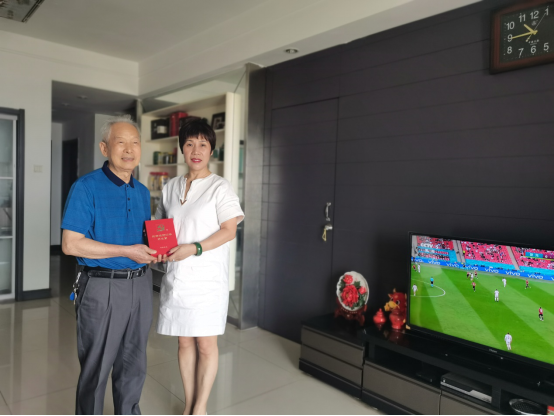 邓其熙、李巧兰两位老师居住在外地,因疫情,学院党委将纪念章邮寄给他们,并转达了党中央、学校党委对他们的慰问和关怀。两位老师非常高兴,表示能够受到党组织的关心,深感欣慰,并发来照片以表达对党的热爱和感激之情。