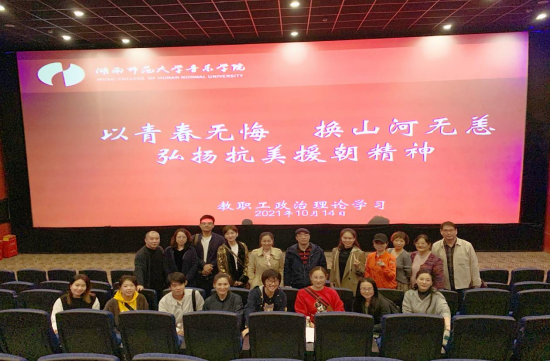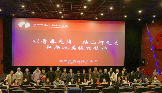 (通信员:刘静怡、刘卿汝)在中国共产党建党100周年,抗美援朝战争胜利70周年之际,为了缅怀英雄,铭记历史,2021年10月15日下午1时,音乐学院组织全体教职员工进行教职工理论学习——观影《长津湖》《我和我的父辈》。